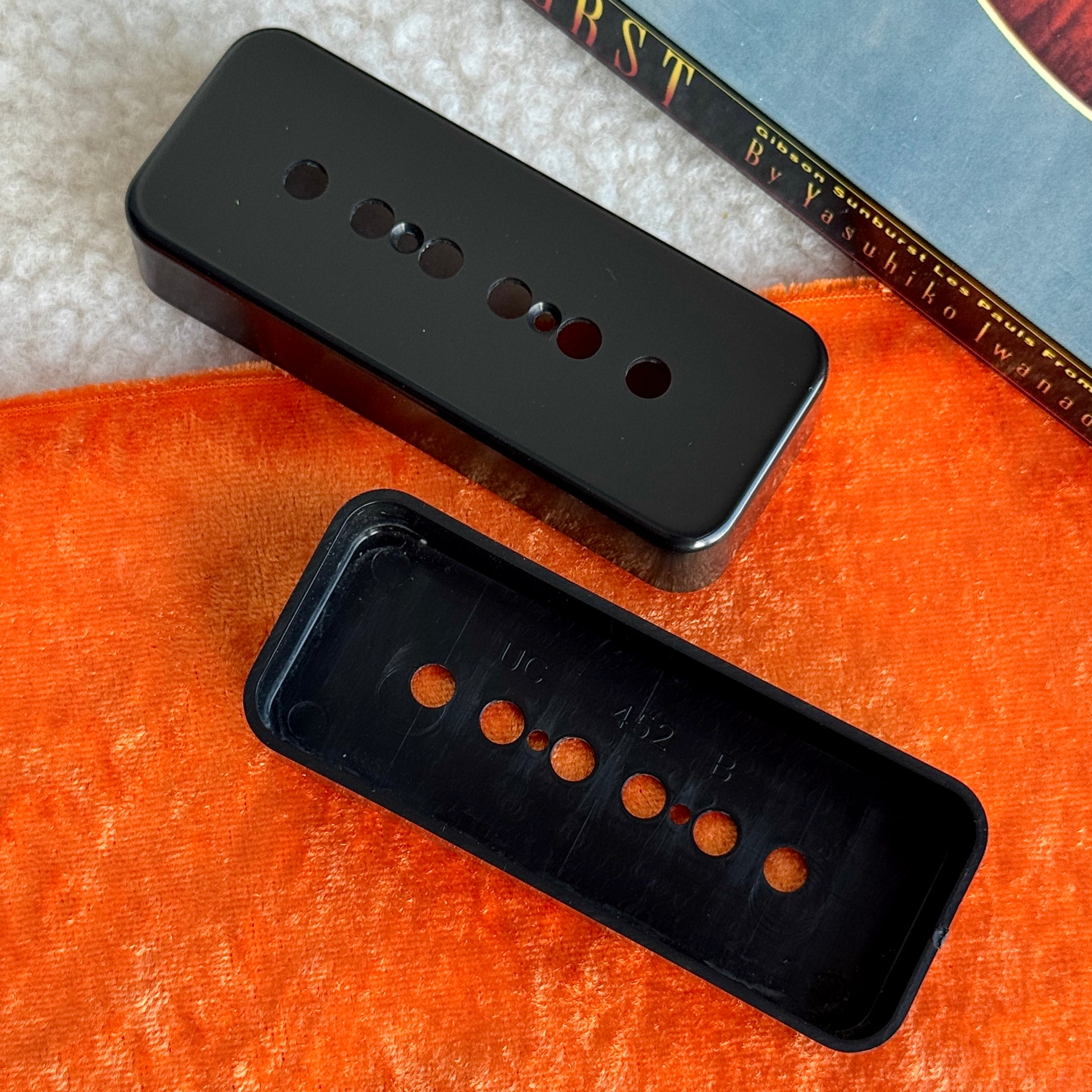 Beautiful P90 Covers replicated in the correct Butyrate material. These Black versions are often found on the killer Les Paul Special and SG Specials of the golden era. What a look with that TV yellow finish & Black Plastics, Gotta Love It! Featuring the correct tooling & mold markings based on 3d Scanning of original parts, you wont get much closer than this unless you source true originals!