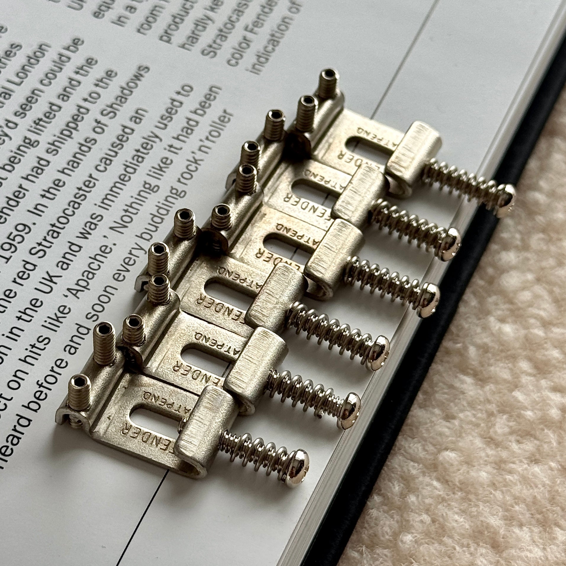 Replica Saddle Set for Vintage Stratocasters® - Made from examining and recreating every detail of the originals, using old plating methods and custom tool & die manufacturers of the highest quality. Exact Replicas of the Originlal Saddles found on your $50k Strats - without being seized up or rotten through the intonation holes.. Improve the playability, sound and feel instantly!